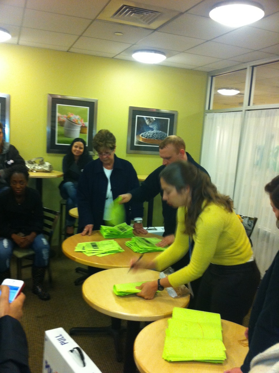 I promised to report the results of yesterday’s NLRB certification election. The photograph shows the scene, with NLRB  officials doing the count. In the room was a rapt audience of over a hundred workers, students, and faculty, awaiting the final count. There were 394 workers eligible to vote, and 343 valid ballots were cast (evidence of active engagement by members of the bargaining unit). 299 workers (or 87 per cent) voted to have UNITE HERE Local 26 represent them. Only 44 workers (12.8 per cent) voted against union representation. When the results were announced, the room was filled with joy, hugs and cheers. It was a landslide victory, 299-44: a mandate for worker dignity, providing an important lesson of a sort that was not confined to a reading assignment.