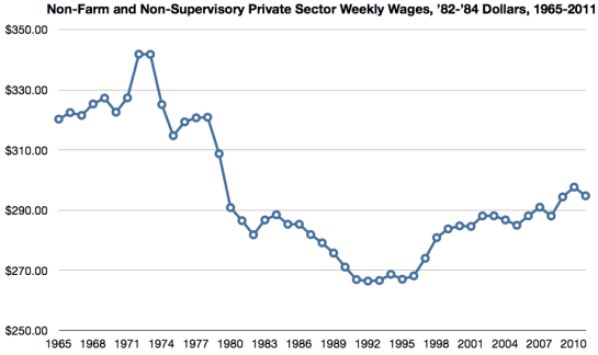 What Silver is tapping into is the logic of voters at the polls. This is an important topic, because this may be ultimately what influences the decision making process for those who are not ideologically wedded to either Governor Romney or President Obama. But it misses an important story that is not about the standing of the country over the last year or the last four years. The fundamental issue here is that Americans, in terms of hourly and weekly earnings, are indeed better off than they were four years ago, but remain worse off than they were forty years ago. What the Republican Party’s rhetoric masks is this trend downward for “average” Americans (a term I use very loosely) that has existed since the 1970s. If Americans are indeed worse off, blaming President Obama does not tell the story that these data do.