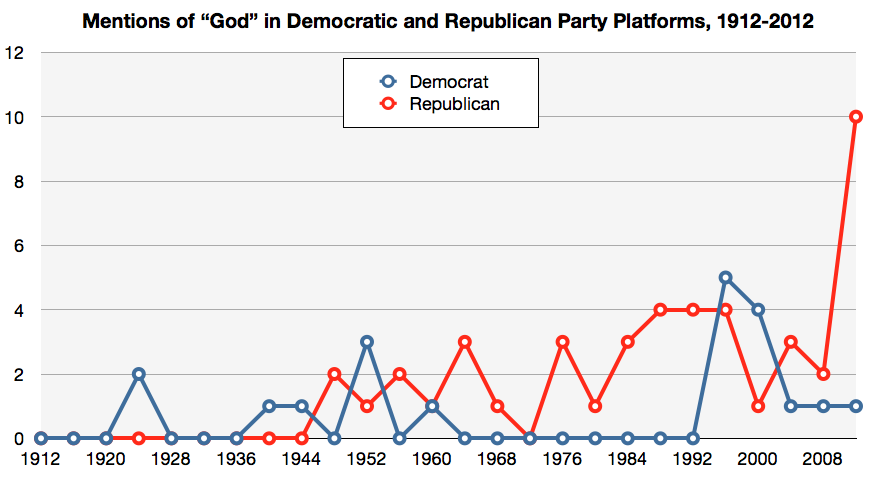 There are a couple of fascinating trends related to this. One is that the use of “God” in party platforms is relatively new. Another is that its been unevenly used. A third is that the current Republican Party Platform is far more religious (by several factors) than any previous GOP Platform.