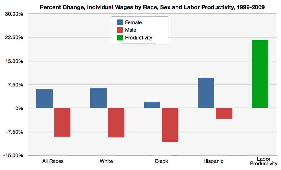 We have mentioned Arne Kalleberg’s latest book Good Jobs, Bad Jobs several times on this blog, and his work perfectly encapsulates what “Platform-gate” misses. This is not fundamentally a debate about individual talent, will, or effort. There have been deep structural changes (which Kalleberg documents in detail) that greatly impact individual outcomes. One example is that, over the ten period from 1999 to 2009 (roughly covering the period between the 2000 political campaign and President Obama’s first year in office), median individual yearly wages have changed dramatically. What is more, these changes have not been even; they are stratified by both race and gender. Yet business labor productivity (measured in output per hour) has grown steadily over the same time period. Indeed, labor productivity has increased markedly since the early 1970s, even as real hourly wages have declined.