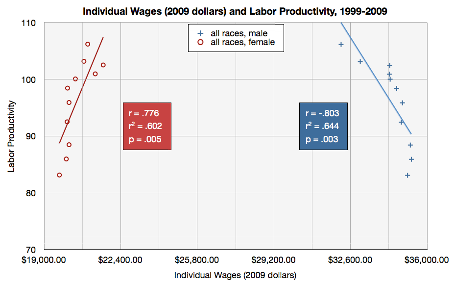 The connection between median individual wages and labor productivity is the subject of quite a bit of research, and there does seem to be a statistical relationship between individual wages (split by gender) and labor productivity. There are strong correlations between wages and productivity between 1999 and 2009, with a negative relationship for men (meaning that productivity rose and wages fell) and a positive relationship for women (productivity and wages both rose). Yet even here, where there seems to be a positive story insofar as women’s wages rose, the gap in median individual wages remains quite large.