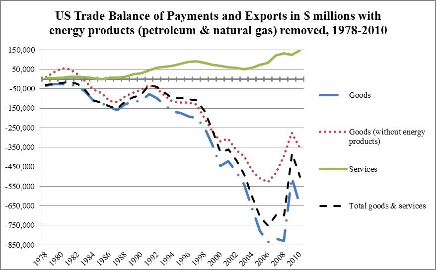 These policies, we argue, would promote job growth. Additionally, the nature of manufacturing jobs is changing, and the training provided in the new educational system will empower workers with the skills needed to bring manufacturing jobs back to the U.S. This, in turn, would have a positive impact on the balance of trade, which has declined dramatically along with the shift from manufacturing to services in the U.S. Service exports do provide a positive balance of trade, but they are not nearly enough to outweigh the cost of manufactured goods imports as shown in the graph below; the U.S. needs to do some manufacturing to bring that balance to a positive, which will ultimately reduce the national debt as well.