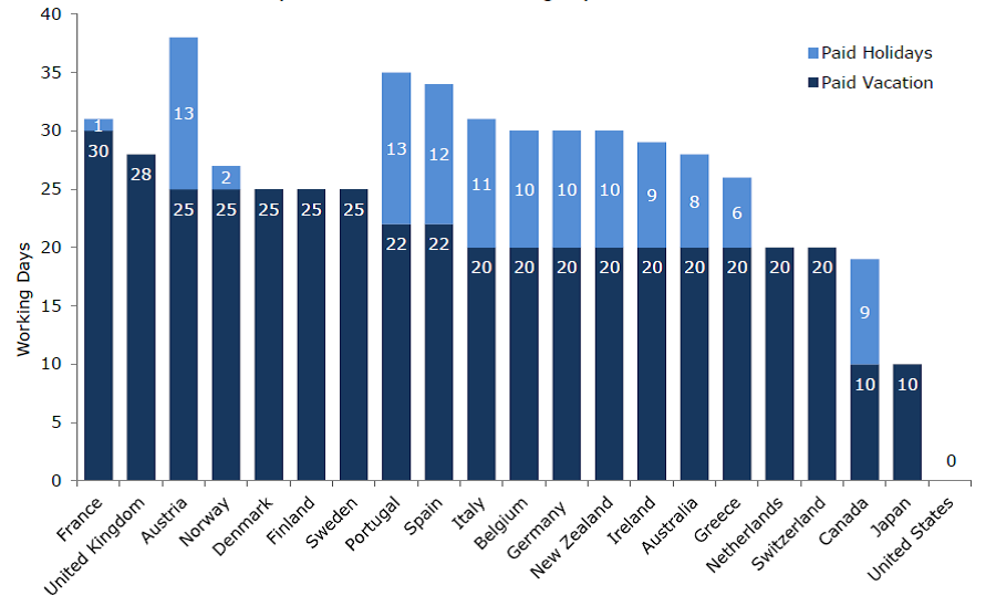 As Rebecca Ray, Milla Sanes, and John Schmitt of the excellent Center for Economic Policy and Research have recently shown, “The United States is the only advanced economy in the world that does not guarantee its workers paid vacation.” In contrast, workers in European countries enjoy a minimum of 20 paid vacation days per year, with some countries legally requiring up to 30 paid vacation days per year. And some counties even have legally mandated paid holidays on top of their paid vacation days!