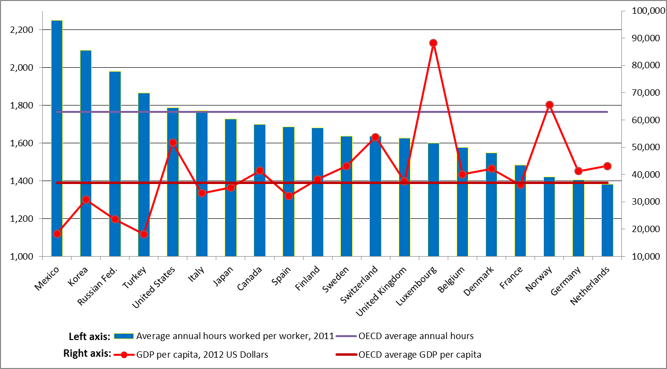 The whole 34-country list might be a bit misleading because the OECD increasingly includes developing countries such as Mexico, Hungary, and Poland, which are not strictly comparable in terms of level of development. In order to compare apples to apples, I’ve a created a chart that includes both average annual hours worked and GDP per capita, along with the 34-country OECD averages for each. (For ease of viewing in a single chart, I’ve used a smaller set of countries, but the results do not change.)