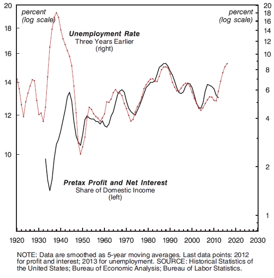 In principle, both scenarios are possible. But as Figure 1 shows, in America the second prevails: unemployment redistributes income systematically in favor of capitalists. The chart contrasts the share of pretax profit and net interest in domestic income on the one hand with the rate of unemployment on the other (both series are smoothed as 5-year moving averages). Note that the unemployment rate is lagged three years, meaning that every observation shows the situation prevailing three years earlier.