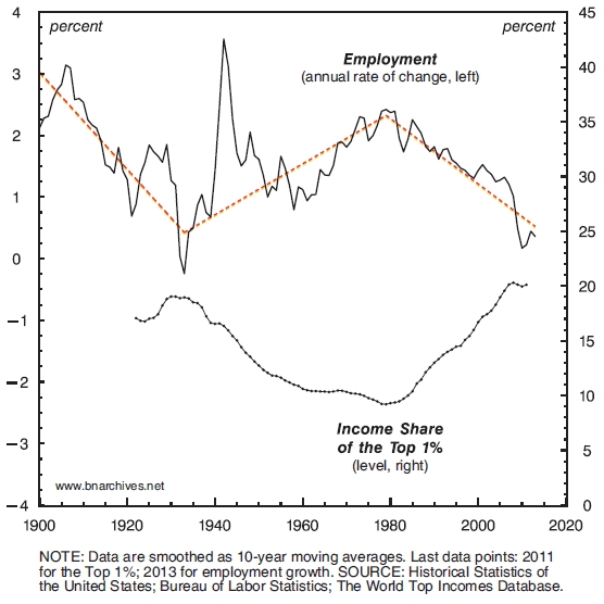 Historically, this negative relationship can be divided into three distinct periods, indicated by the dashed, freely drawn line going through the employment growth series. The first period, from the turn of the twentieth century till the 1930s, is the so-called Gilded Age. Income inequality is rising and employment growth is plummeting.