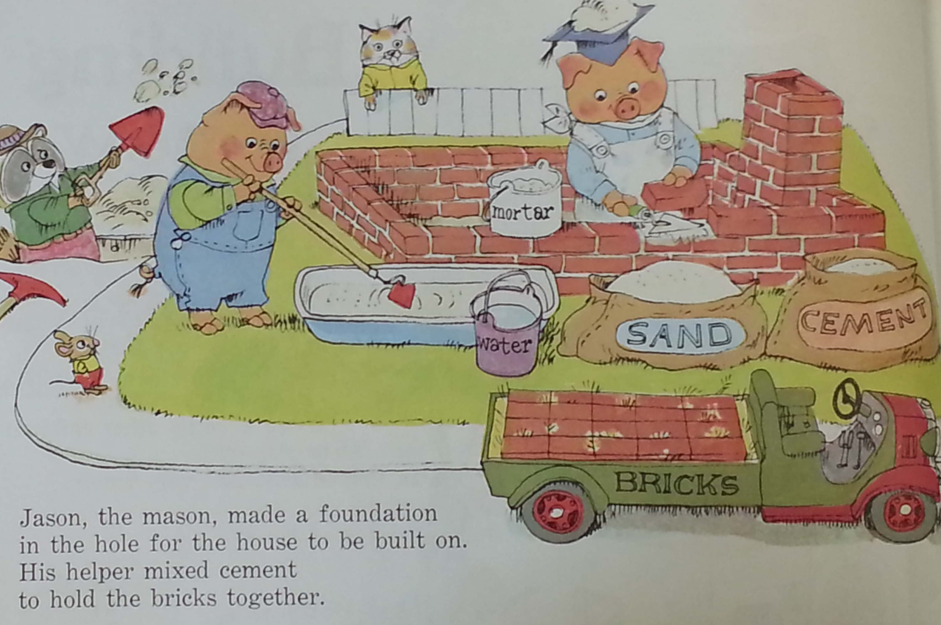 Which brings me to the odd-looking image shown above. One of my department’s graduate students gave me as a Christmas present Richard Scarry’s book, What Do People Do all Day? A classic kid’s book, it uses animals to represent the division of labor that exists in Busytown. On a lark (so to speak), I googled the book, and eventually came up with a brilliant piece of analysis by John Levi Martin (see his 2000 article, “What Do Animals Do All Day?” in Poetics). To oversimplify greatly: Martin constructs a sophisticated empirical analysis of nearly 300 children’s books, and finds that there is a marked tendency for these texts to represent certain animals in particular kinds of jobs. Jobs that allow the occupant to exercise authority over others tend to be held by predatory animals (especially foxes), but never by “lower” animals (mice or pigs). Pigs in particular are substantially overrepresented in subordinate jobs (those with low skill and no authority), where their overweight bodies and (judging from the plots of these books) congenital stupidity seems to “naturally” equip them for subservient jobs. Here, see this additional image from Scarry’s book, showing construction work being performed by the above-mentioned swine.